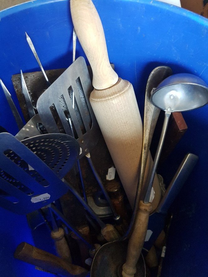 We rummidged for a good three hours, getting dusty, feeling excited about finding items that you honestly can’t buy now, like heavy enamel pans, steel kitchen utensils and a whole sharabang of things we need for our homes…and not a “Made In China” label in sight!