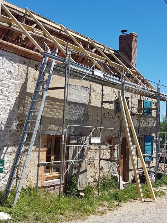 Then last year I inherited. Life changed. Suddenly we could actually get our roof repaired. We bought the barn adjoining ours and sent an enquiry over to our local roofing firm to provide the devis, the quote in French for both and our little house too. The poor old thing had a patched mess of black plastic, insulation and tape keeping the rain out. The wasps, ants and other crawlies shared the roof along with sparrows and their fledglings, hornets and more spiders. We slept under that roof for three years, hanging an old sheet from the rafters to stop things landing on us at night. When the winds tore up from the south, where the volcanoes slumber in the Avergne, you felt as if the house would be wisked up and away like Dorothys house, to Oz.