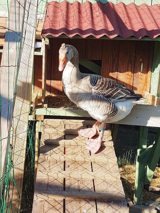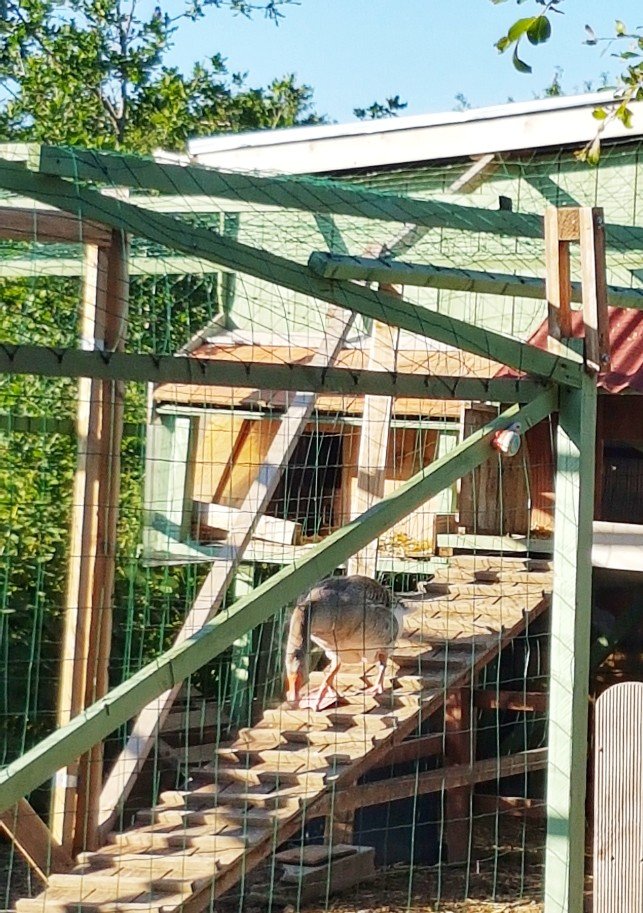 Barley chose a secret spot near the chicken forest area. Shadows, quiet and secluded. But no protection from rain. A torrential downpour yesterday resulted in a quick build of a pespex roof with four rickety timber supports plonked on top of her nest in a moment of mummy goose vacating to go and shout at Daddy goose.