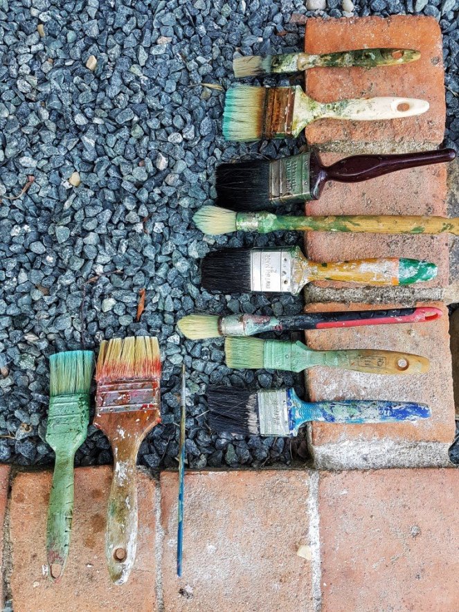 Sometimes I will sand off the paint on the handles and renovate if the brushes have value. If not, I just clean and trim off broken hairs. Very tatty brushes get their handles cut short and can then be used for hard to access jobs which destroy your brushes anyway. I often trim brush hairs to different angles to allow neat edges when cutting in paint. Some of my brushes are now over sixty years old, handed down by my family or rescued from brocantes.