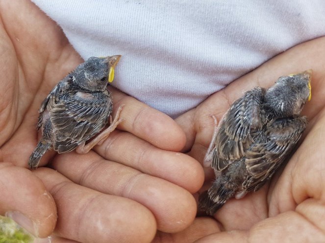 Baby sparrows. Oh dear. Learning to fly is perilous. The birch trees are full of virgin baby flyers and nearly 50 percent don’t make it. The predators are circling. Or they land in the goose pond or an accidentally left bucket that we have forgotten to turn over. They drown or starve. It’s awful and we try to move water buckets away from trees and keep an eye open for fallen babies.
