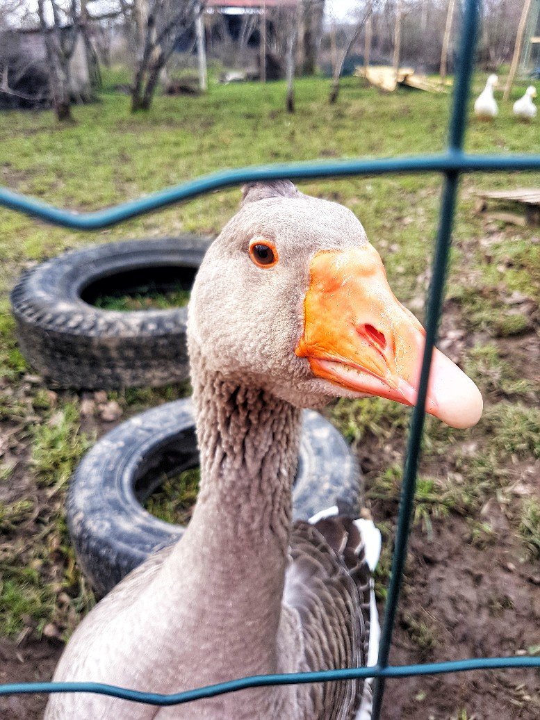 Cashew and Pekin with matching head tufts like Daddy stand in the background with mummy goose Barley. She always hovers at the back. A lovely gentle goose. If you call her she comes over for treats, IF Bumble doesn’t muscle in.