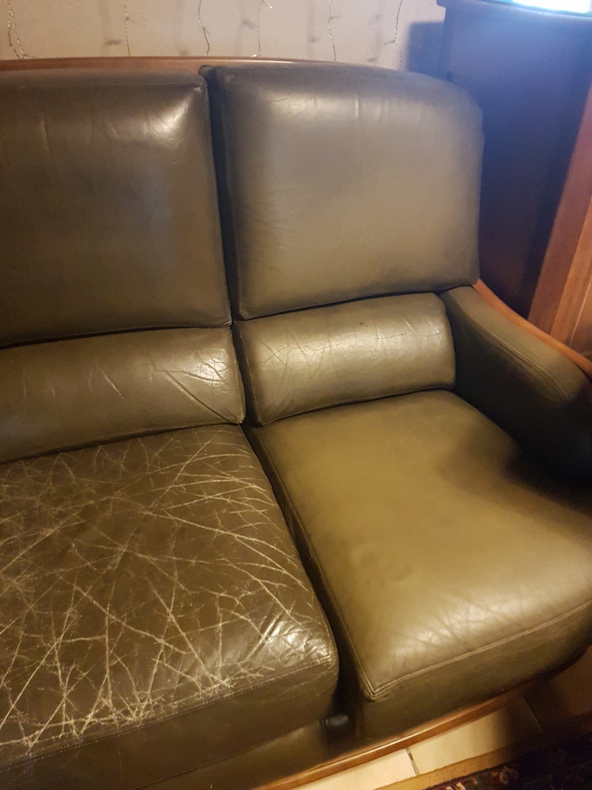 The sofa emitted an unidentifiable aroma and was full of grit and old dust. Greasy patches from hair oil and too many other sources had turned the sage green into a sludgy mud green. Some of the leather has cracked but happily most is simply dirty. The main timber structure with reed woven sides, colonial style are imaculate and no work needed on those. Armed with my trusty cleaner and leather restorer and many interruptions from Bella trying to grab the cloth, it came up ok.