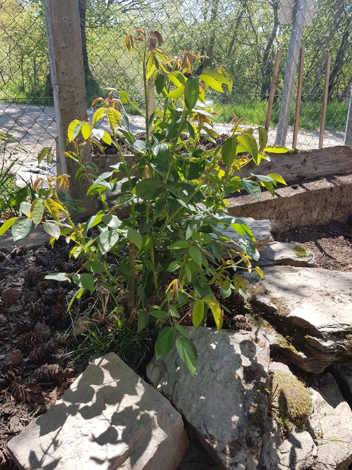 So this week I rebuilt the front bed, yanking up yards of plastic that had failed to block out weeds. The stones had fallen and the poor roses were leggy with the odd sad little bud. A month ago I pruned them hard. Yesterday they were a foot high and full of fresh growth and potential flower heads.
