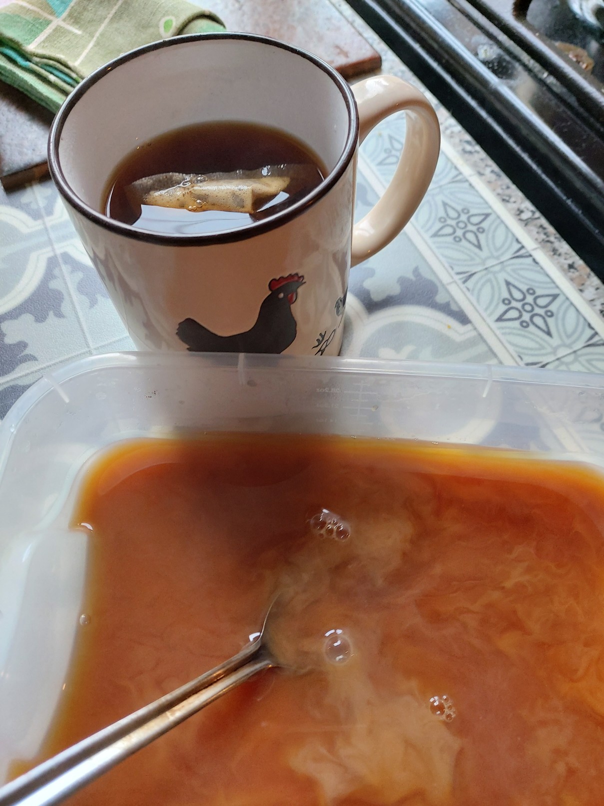 The French drink coffee but these die-hard Brits still drink tea, Yorkshire Tea with two sugars. Builders strong tea is a bit too tannin for us but a four minute brew and a dash of semi-skimmed milk is perfect.We manage to buy a few British brands here in France via a local couple who run a gite and shop. Usual things we love, custard, ginger biscuits, Branston pickle, thick cut orange marmalade, curry sauces and tea. The thought of no tea for me is unthinkable. I exist on tea. I need it to wake up, to go to sleep, to cool me on a hot day and warm me on a cold one. That’s why tea is amazing. And somehow the dogs have a liking to this beverage too. Better stock up then.