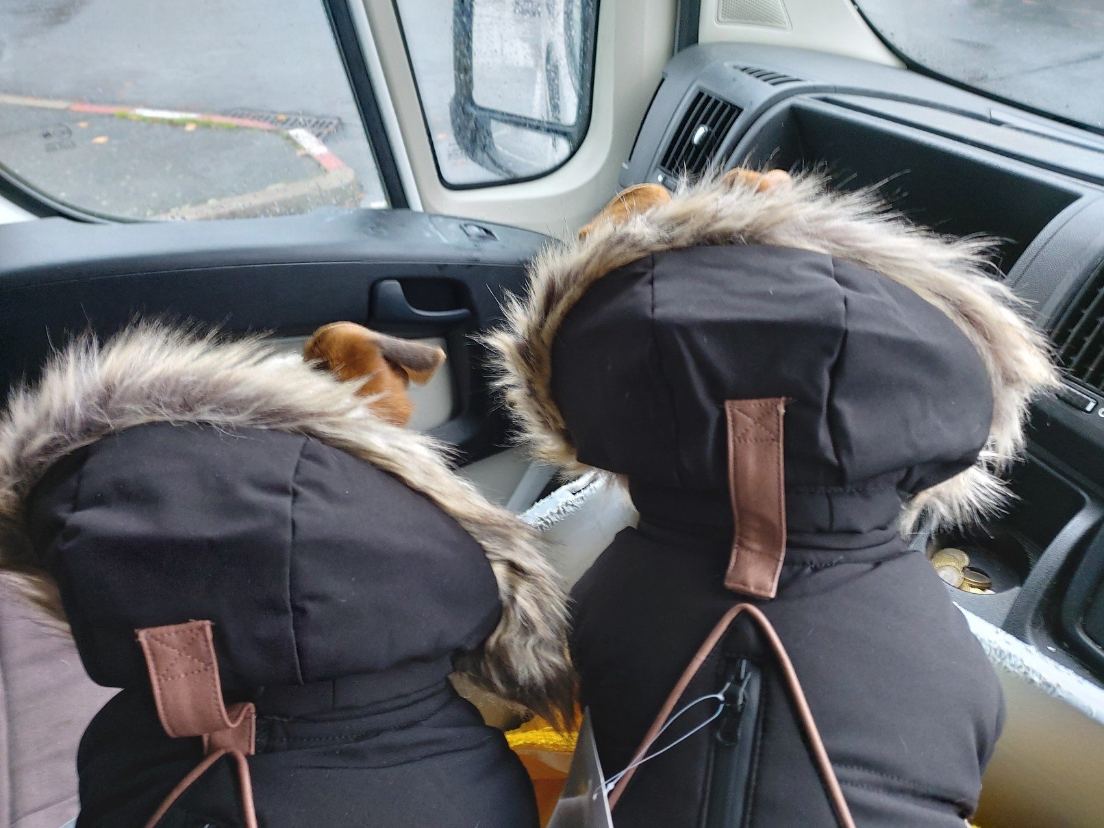 At first I thought it might be trauma. The first jackets we bought involved hand to hand or rather hand to paw fighting and lots of snapping of teeth. This time they stood and lifted each paw obligingly into the leg holes. Velcro velcroed and zips zipped, success and no tantrums.