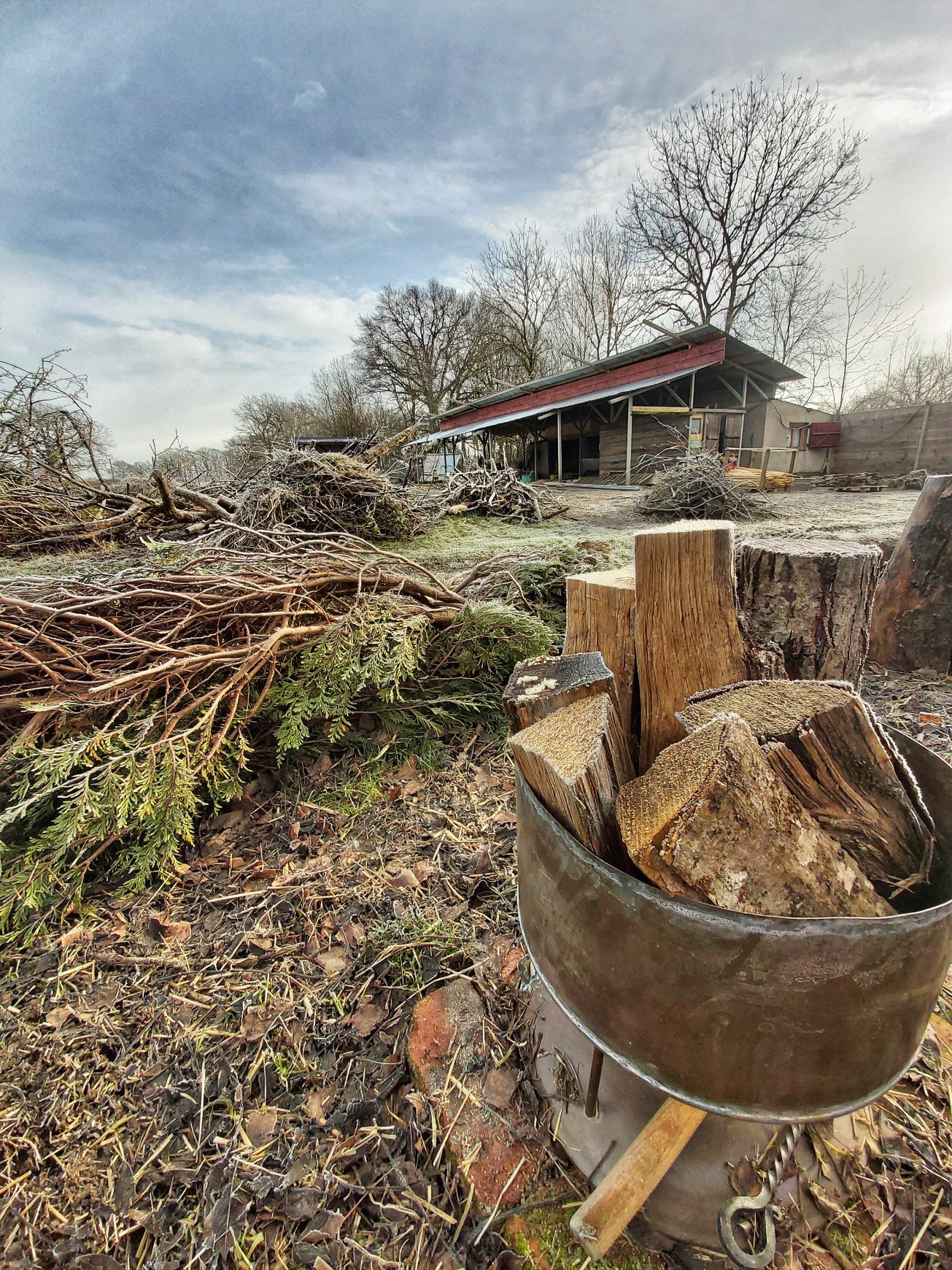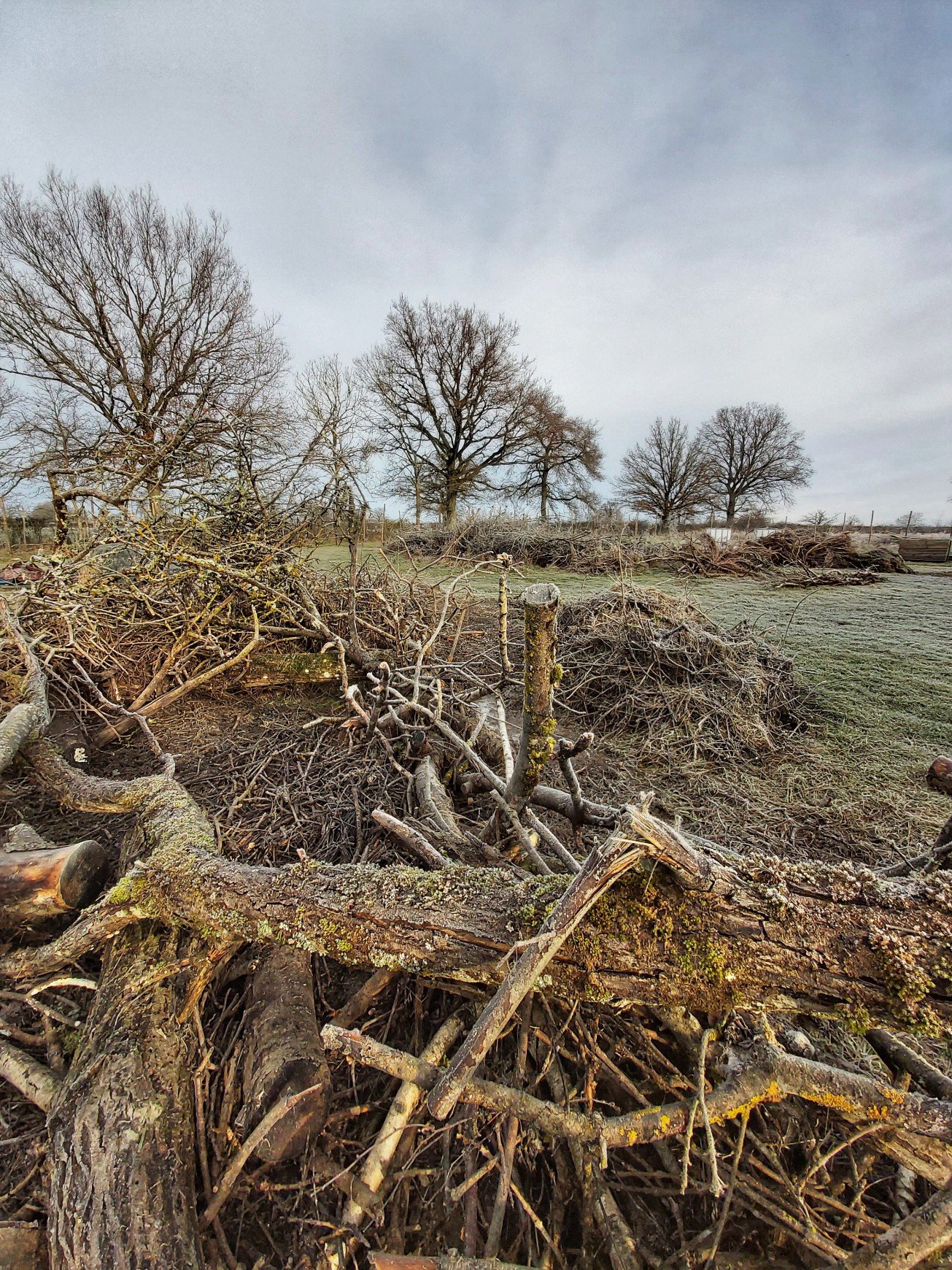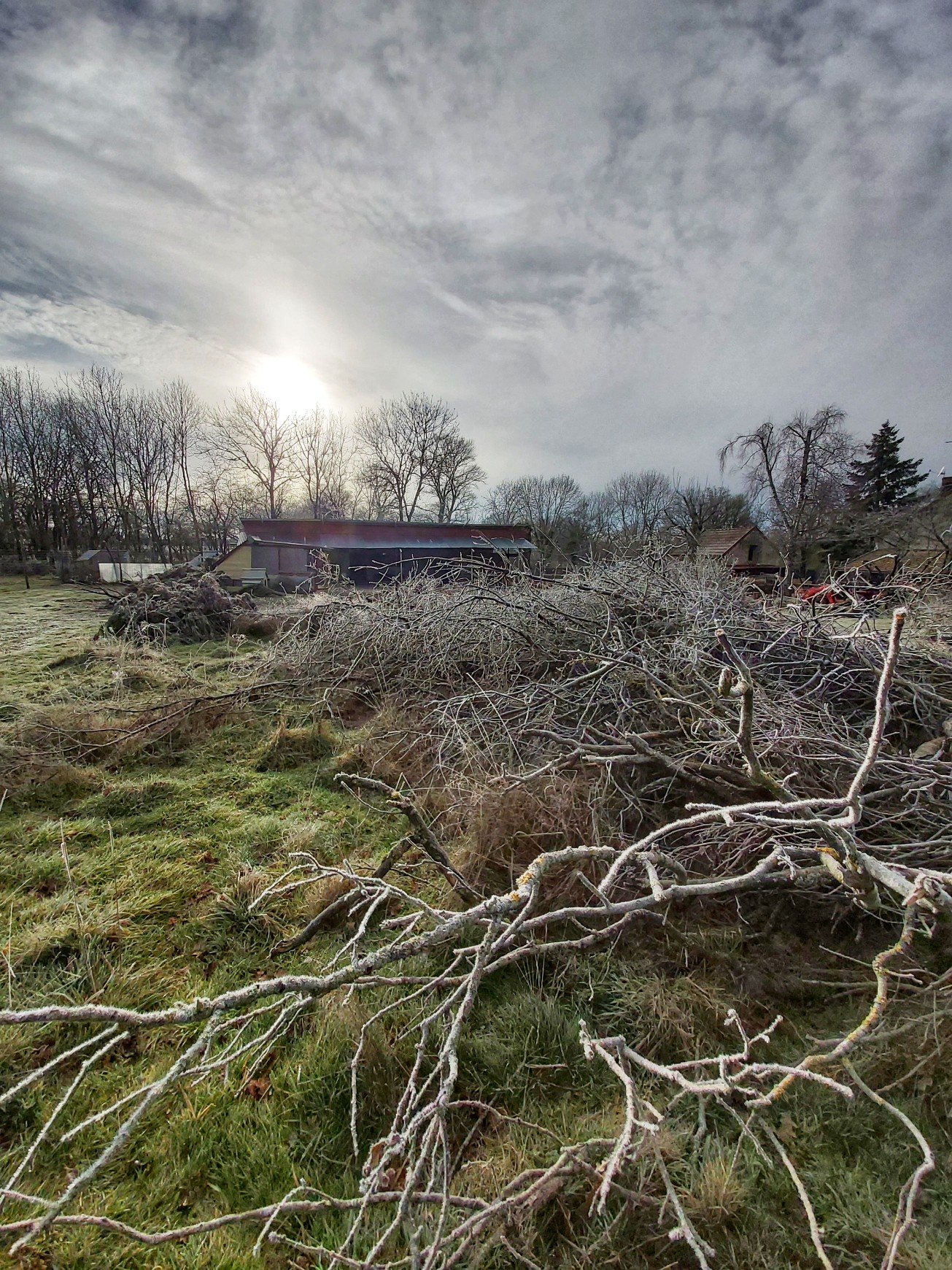 This morning was a sharp, crisp take your breath away chill, but the sun was peeping dramatically between the thunder clouds and that meant camera time. Saturated greens and greys and white frost crystals made the shots relatively simple. I went wide angle to stretch the perspectives more and gave a minor contrast tweak in Snapseed.