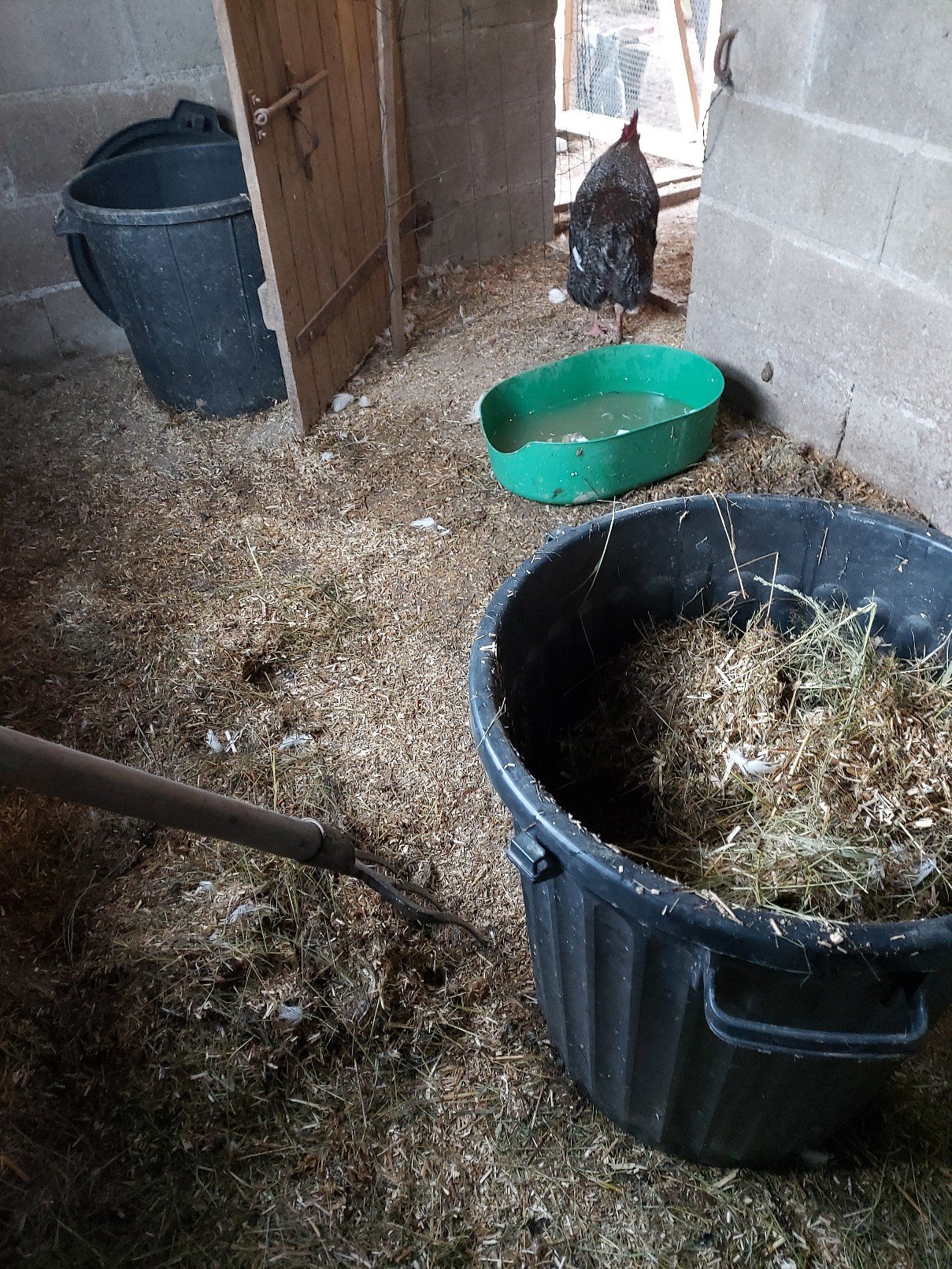 With the meal worm hunt in progress I can tackle the duck section of the coop. With my accidental purchase of six cockerels last year, they have the official duck house. Its not ideal but with squabbling boys I needed space. Poor Penquin and Heff therefore headed to the chicken coop where its warm but not so duck friendly. Ducks poop alot and make a mess with their food and water. After a week the whole floor is soggy and muggins here must carry it all out. Heavy work as the door is smaller, the access tighter. I now have Popeye biceps.