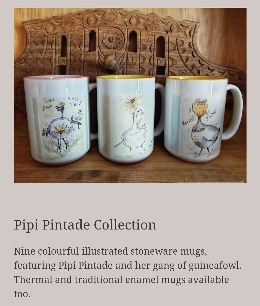 My husband had bought a mug sublimation unit, so why not try that first. I decided to complete ten pintade illustrations and test the market. I posted to the forum and in just 24 hours I hit over 380 likes with comments from every one of those. That doesn’t seem alot, but it confirmed my sketches brought smiles and happiness. I felt a little like I had put the cart before the horse. Asked if I sold these, all I could say was that they were in progress.