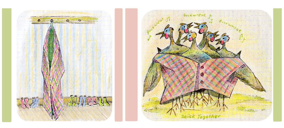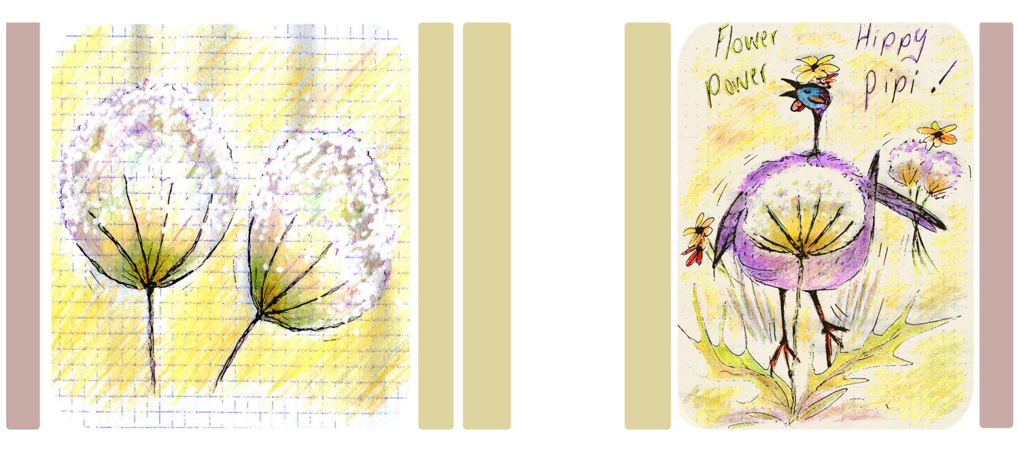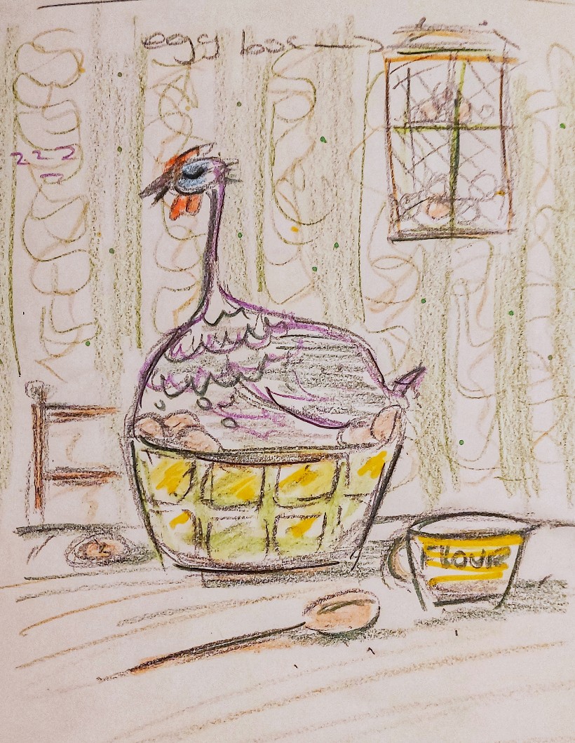 So Pipi Pintade was born. Pintade is French for Guinea Fowl and the antics of this screaming crew supplied hours of entertainment. I joined a huge Guinea Fowl forum and entered a world where these birds are cherished, sort after, collected and appear to give endless joy to their owners. It was different world. March was cold and I doodled a pintade in a thick wooly jumper in my sketchpad. She was sort of cute. I then drew another with a dandelion and another with a spotted, pocket handkerchief on her head.