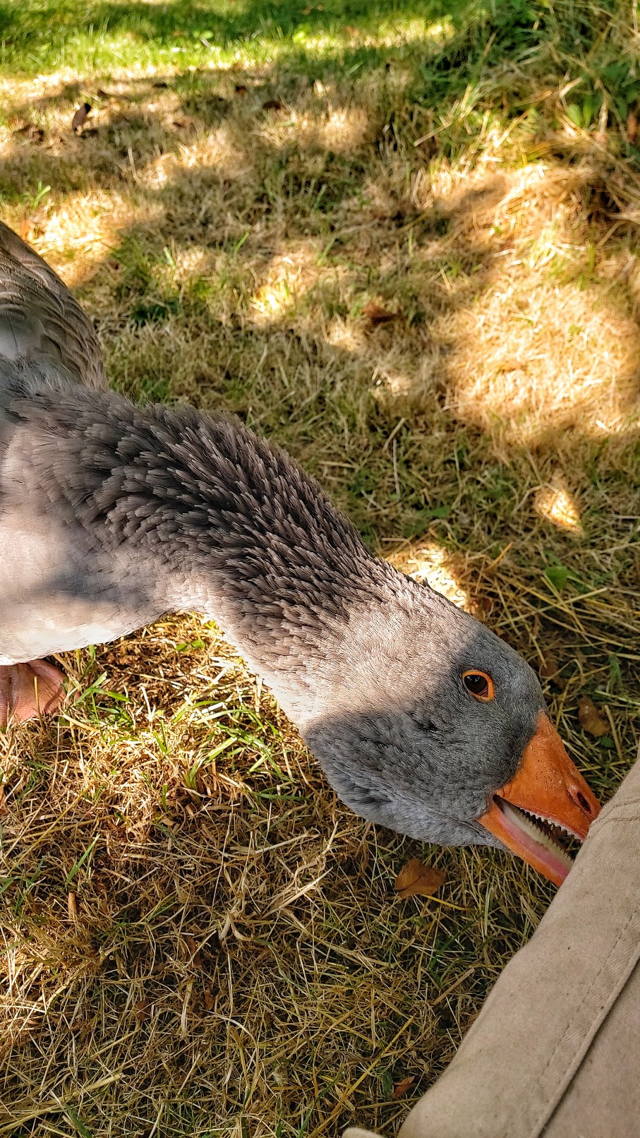 I have concluded over the last few years that geese are very courageous, thoughtful and intelligent birds. Bumble over eggs his duties to guard and chases me if I have a bag of hay or apples from the garden and I honestly think he sees the bag as another goose that needs protecting. So today I sat under the apple tree with the bags. I had tough trousers on, thick socks and my phone. The guys came over and I just sat quiet. I got nibbled and Bumble was a little nervous. He lowered his head, but didn’t hiss. I didn’t move, but spoke softly to greet him and ask how his day was. Bonnie and Pip came too and as usual stood in front of me and bobbed their heads and yawned.