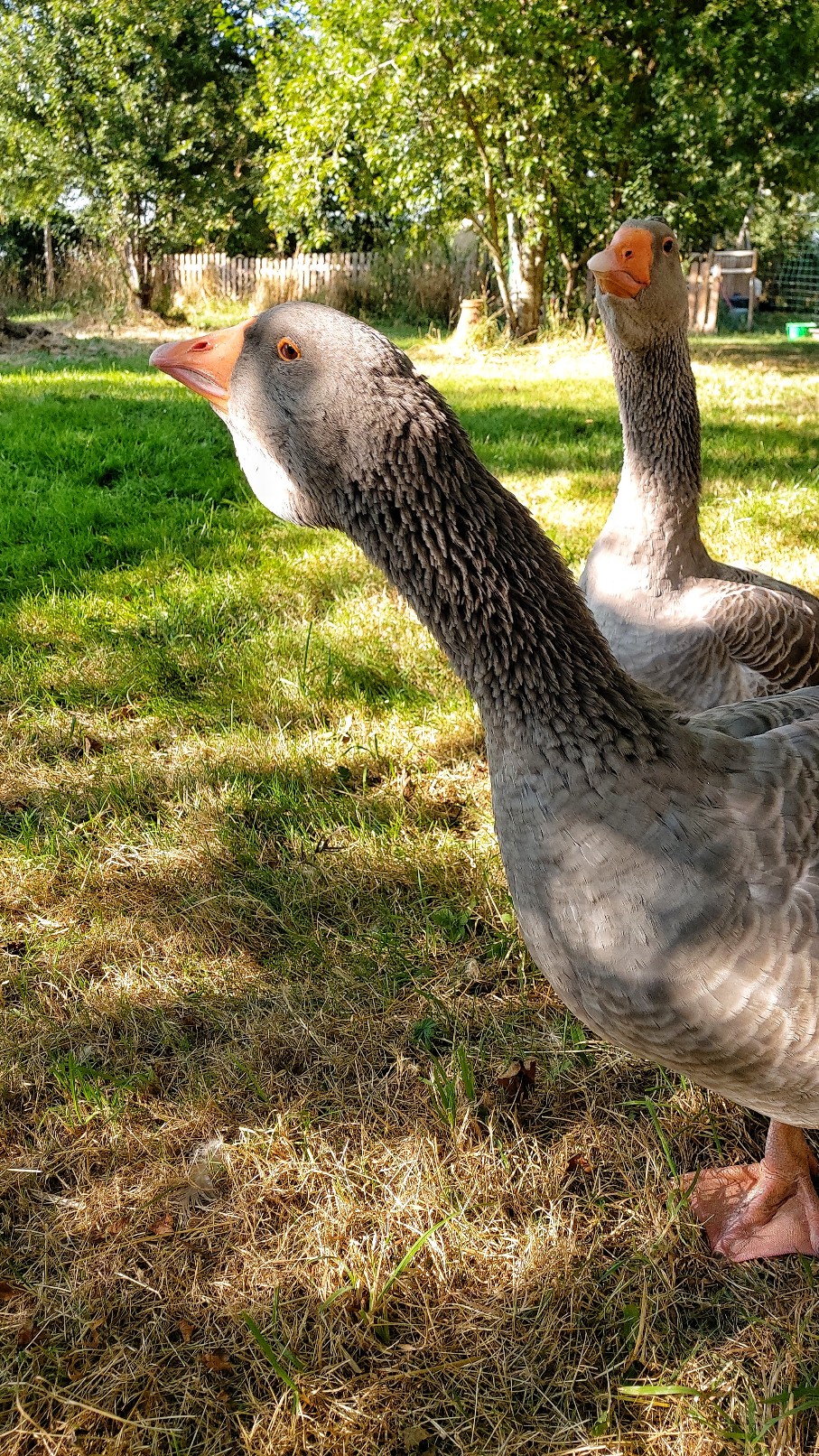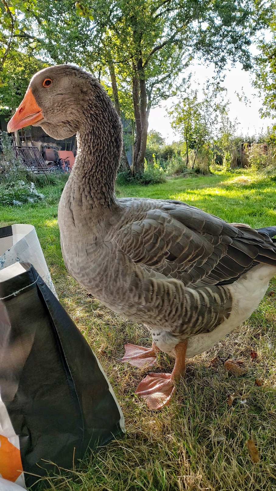 Since then he has grown into a huge goose, a Toulouse with a large dollop of grumpy dewlap in him. That’s the floppy bit under his beak. Although no trouble, he does like to peck and act a little territorial. His companion often tell him off. He hates being told off and his moment of triumph making sure I don’t achieve my tasks, falls flat. I have never been hurt by Bumble and often hear on forums that other people have been hurt really bad in goose attacks, but I wanted to reassure him I am OK, as mostly a goose attack is due to fear, misunderstanding or they are protecting their flock.
