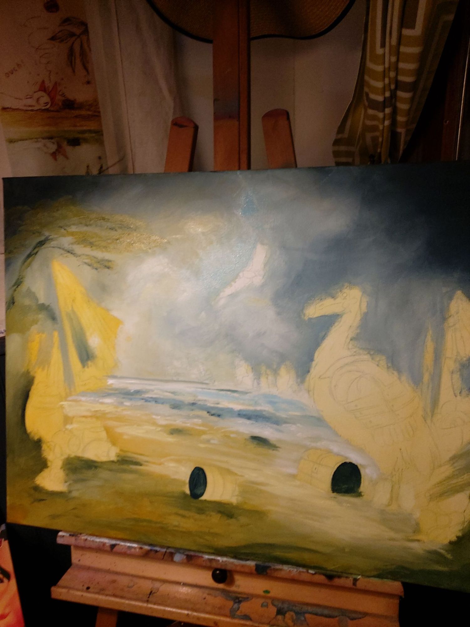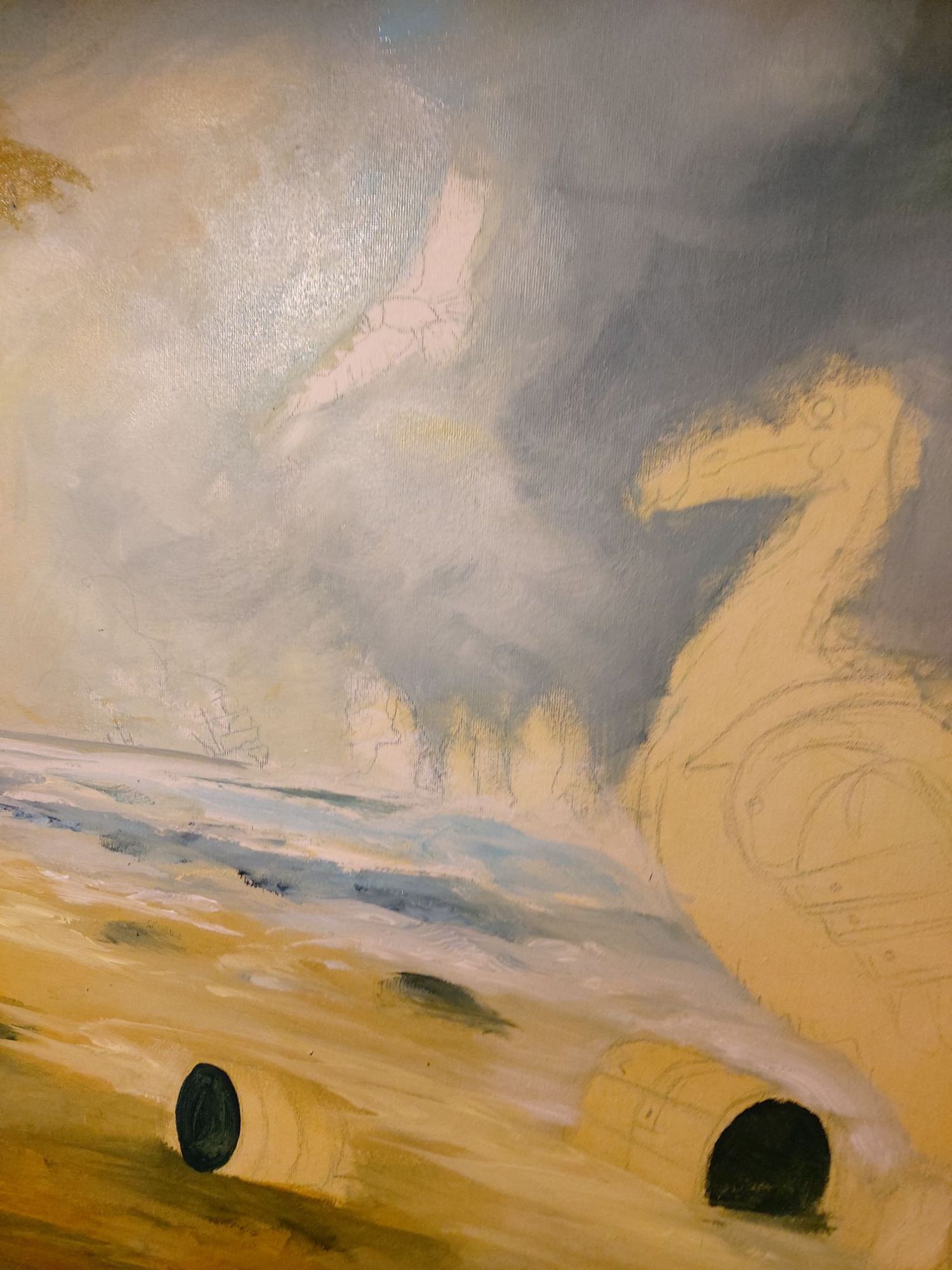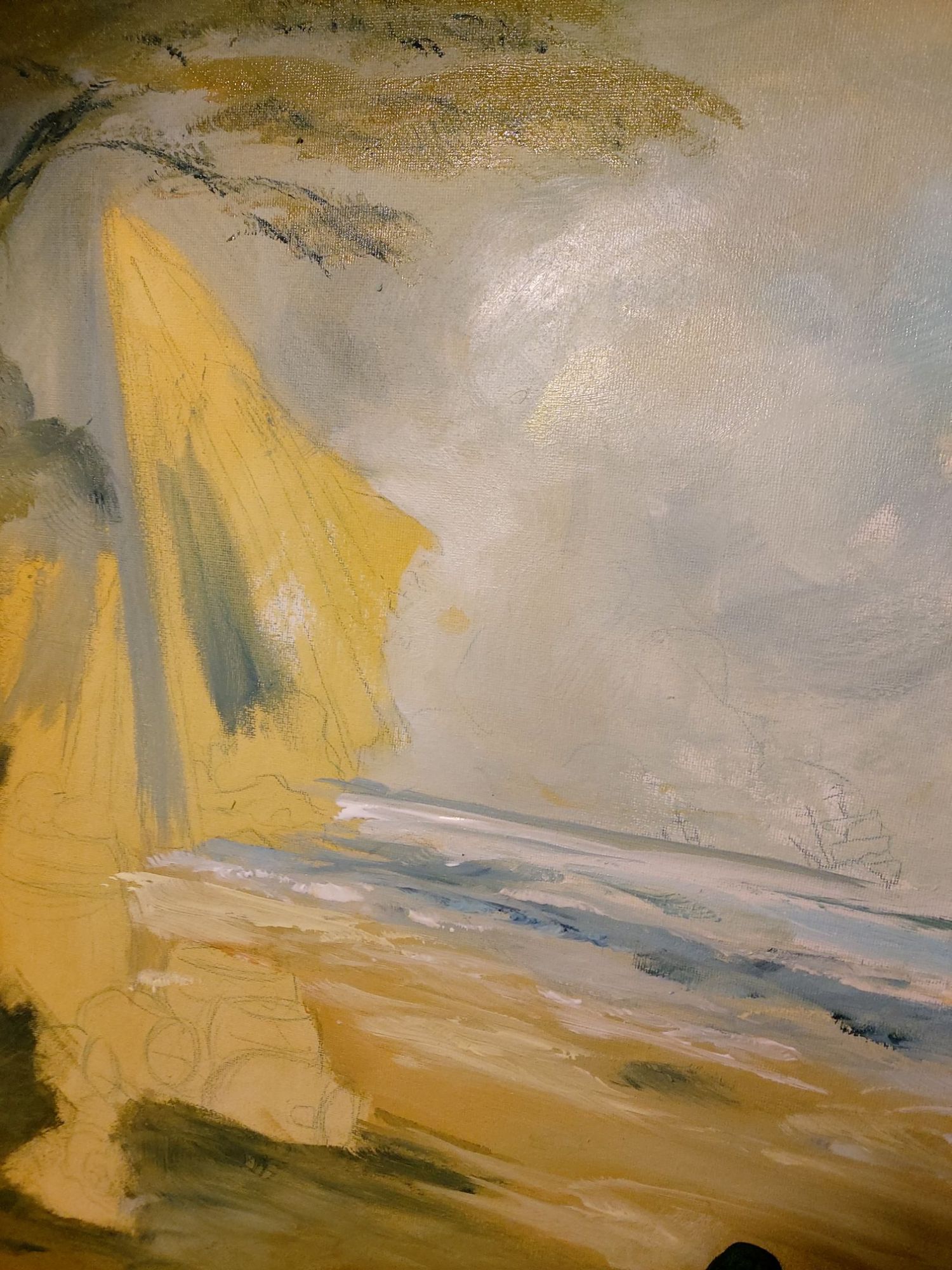 Finally after 3 weeks of staring at the white canvas, I braved a start, laying down a yellow ochre wash to get the tonal values right.