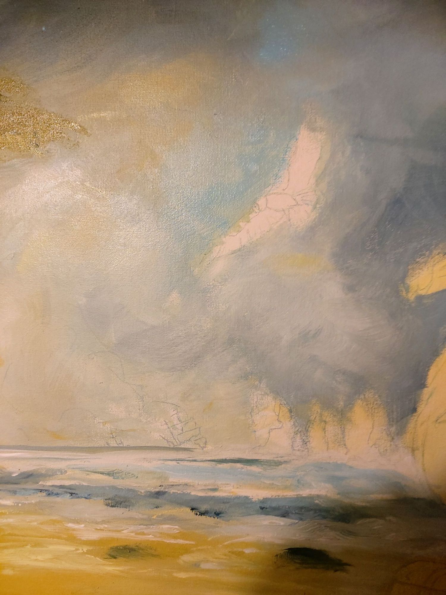 I like to get the skies down first as these help control the tones of the rest. I use impasto on the waves to add dimension and there will be many glazes as I work on details.