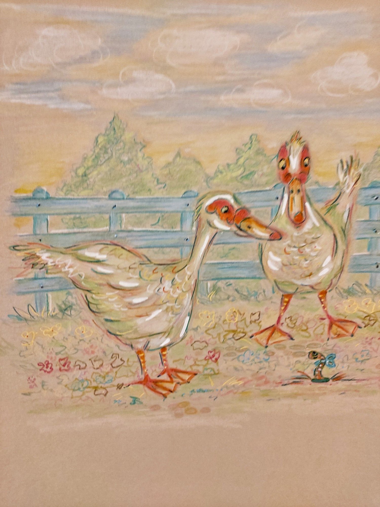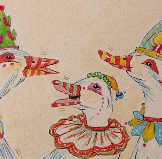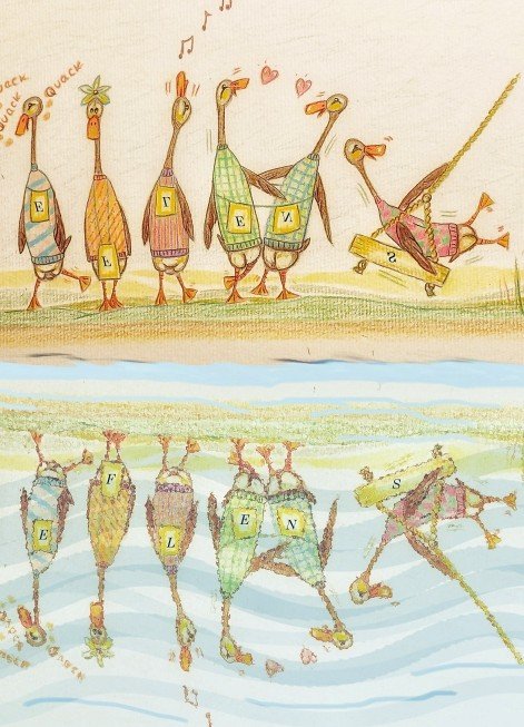 I have a little studio near my French farmhouse where I work on commissions, book illustration and fabric designs. I keep a flock of ducks, geese, chickens and one guinea called Bovril. They are my joy and inspiration. ♡